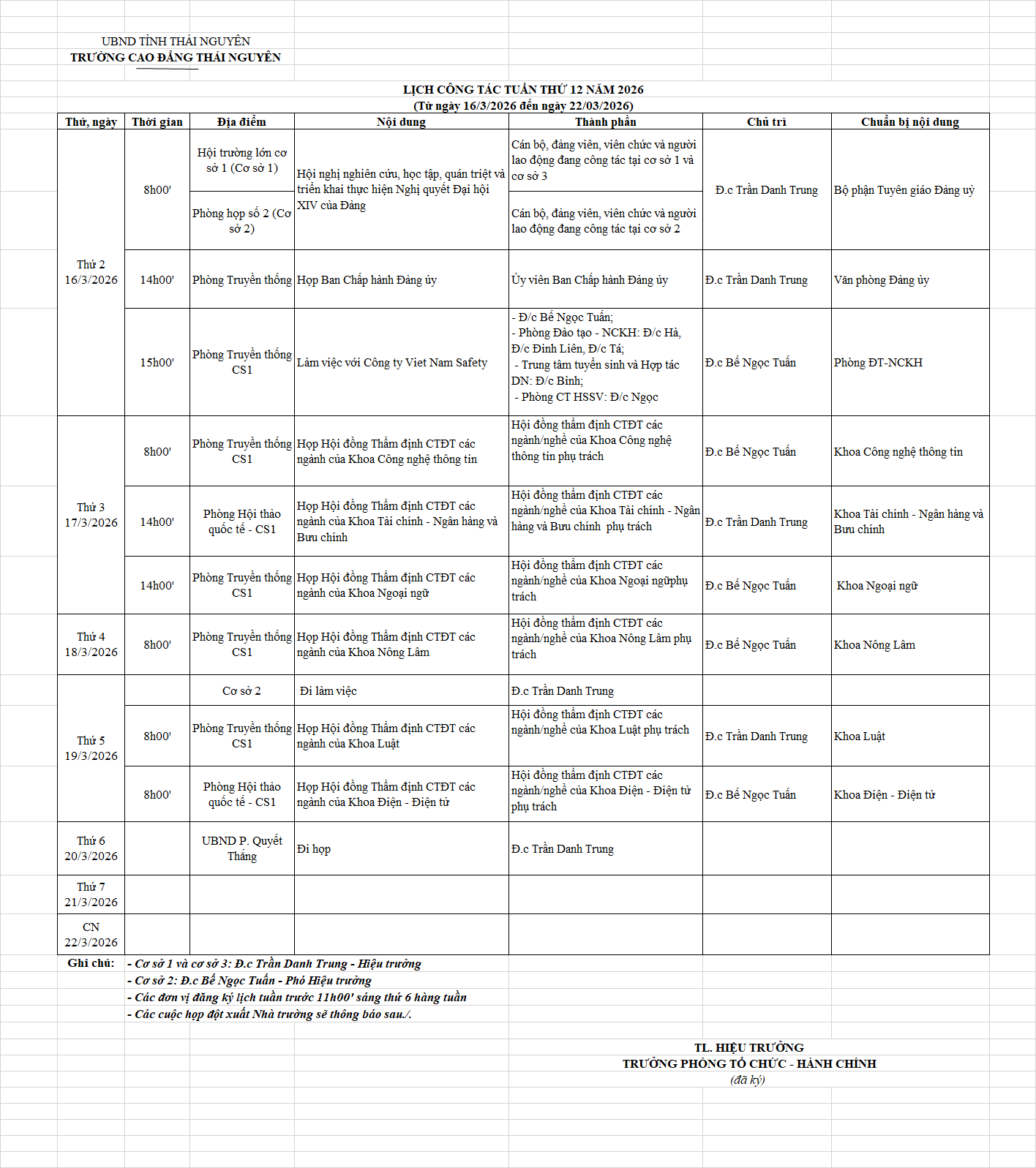 Lịch công tác tuần 12 năm 2026