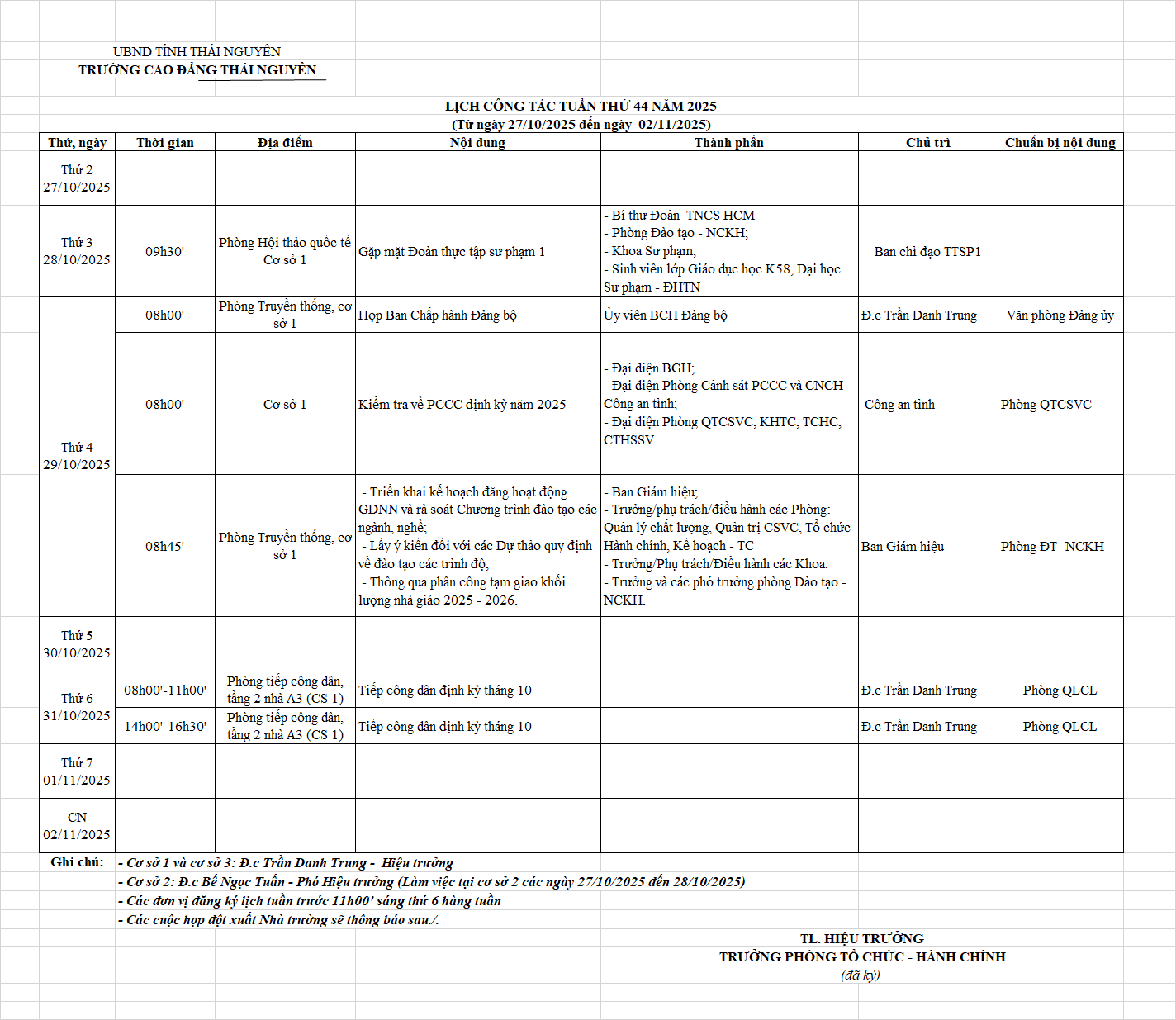 Lịch công tác tuần 44 năm 2025