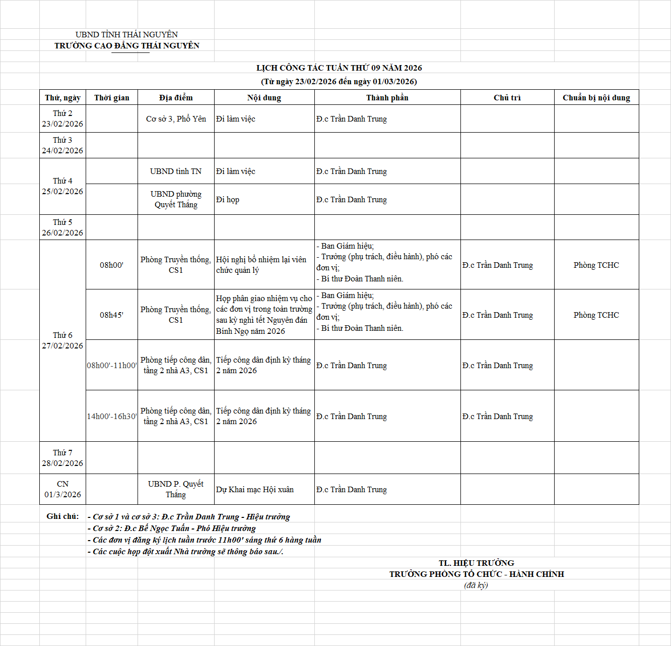 Lịch công tác tuần 9 năm 2026