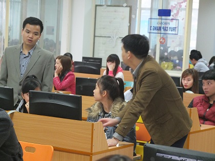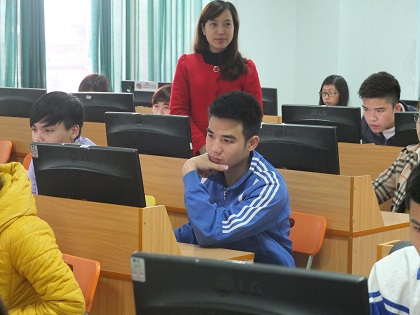 Các giám thị hướng dẫn thí sinh thao tác đăng nhập làm bài - Hình ảnh tại phòng 2.3 (tang 2 TTTV)