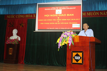 Đồng chí Chu Mạnh Cường-trưởng phòng Công tác HSSV đã thông qua báo cáo tổng kết tình hình HSSV trong năm học 2016-2017 và công bố các quyết định khen thưởng của nhà trường đối với những HSSV đạt thành tích cao trong học tập, rèn luyện và tham gia các hoạt động thi đua do nhà trường phát động. Đại diện HSSV các lớp, các khoá đã có dịp đối thoại với Ban giám hiệu, các khoa, phòng trong nhà trường để khắc phục những tồn tại trong các lĩnh vực đào tạo, phục vụ đào tạo để nhà trường nắm bắt kịp thời và có phương hướng giải quyết hiệu quả trong thời gian tới.