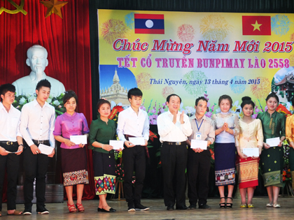 Đ/c Phùng Đình Thiệu-UV ban thường vụ tỉnh uỷ, trưởng ban dân vận, chủ tịch hội hữu nghị Việt-Lào tỉnh Thái Nguyên tặng hoa cho lưu sinh viên Lào của trường.