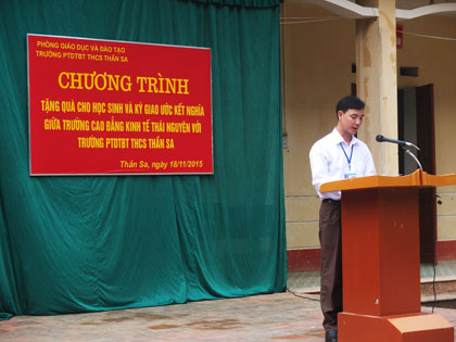 Tiếp tục xúc tiến chương trình " Chung tay hỗ trợ phát triển giáo dục vùng cao", ngày 18-11-2015, đoàn công tác trường CĐ Kinh tế-Tài chính Thái Nguyên đã đến điểm trường TH dân tộc bán trú PTCS xã Thần Sa, huyện Võ Nhai tỉnh Thái Nguyên tao quà và ký giao ước kết nghĩa giữa hai trường.