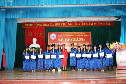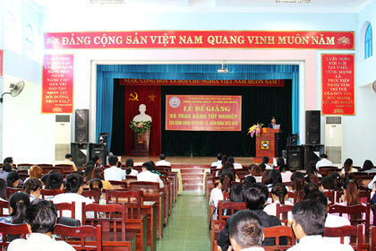 Mở đầu buổi lễ, cô giáo Trương thị Minh Huệ đã đánh giá khái quát quá trình học tập, rèn luyện của học sinh, sinh viên qua từng năm học. Thày giáo Nguyễn Công Dương-Bí thư Đảng ủy, Hiệu trưởng nhà trường, thay mặt các thày cô giáo phát biểu động viên, nhắc nhở các tân cử nhân hãy tự tin với tấm bằng tốt nghiệp của mình, mỗi người hãy vận dụng những kiến thức học được trong những năm qua để sớm tìm cho mình một công việc hưu ích, một con đường đi riêng để lập nghiệp, lập thân. Cũng trong buổi lễ, các học sinh, sinh viên có kết quả học tập, rèn luyện khá, giỏi đã được nhà trường tặng giấy khẹn và những phần thưởng xứng đáng, động viên các em trước khi rời mái trường đã gắn bó trong những năm vừa qua.