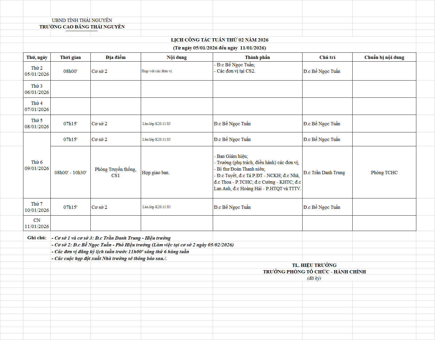 Lịch công tác tuần 02 năm 2026