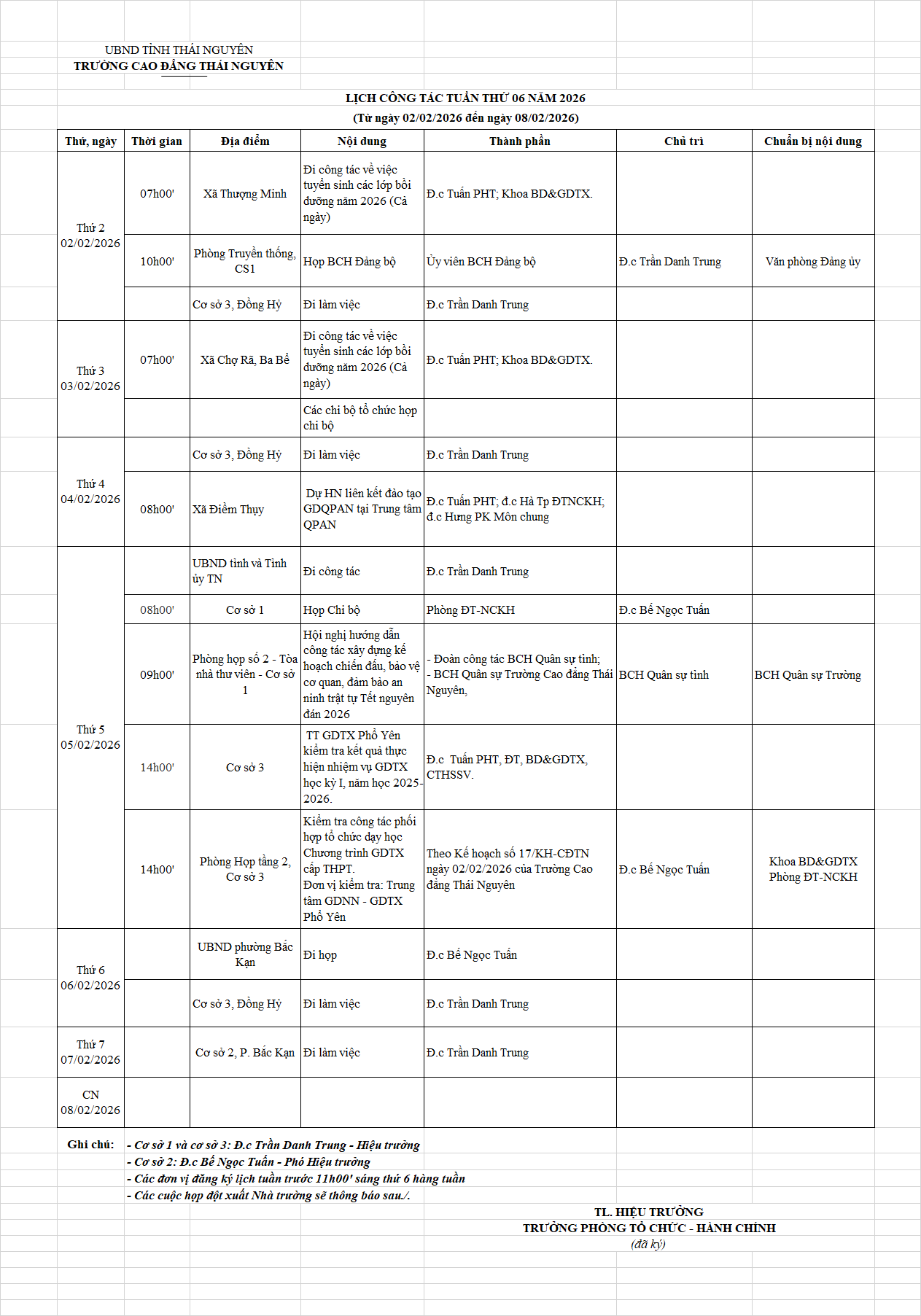 Lịch công tác tuần 06 năm 2026