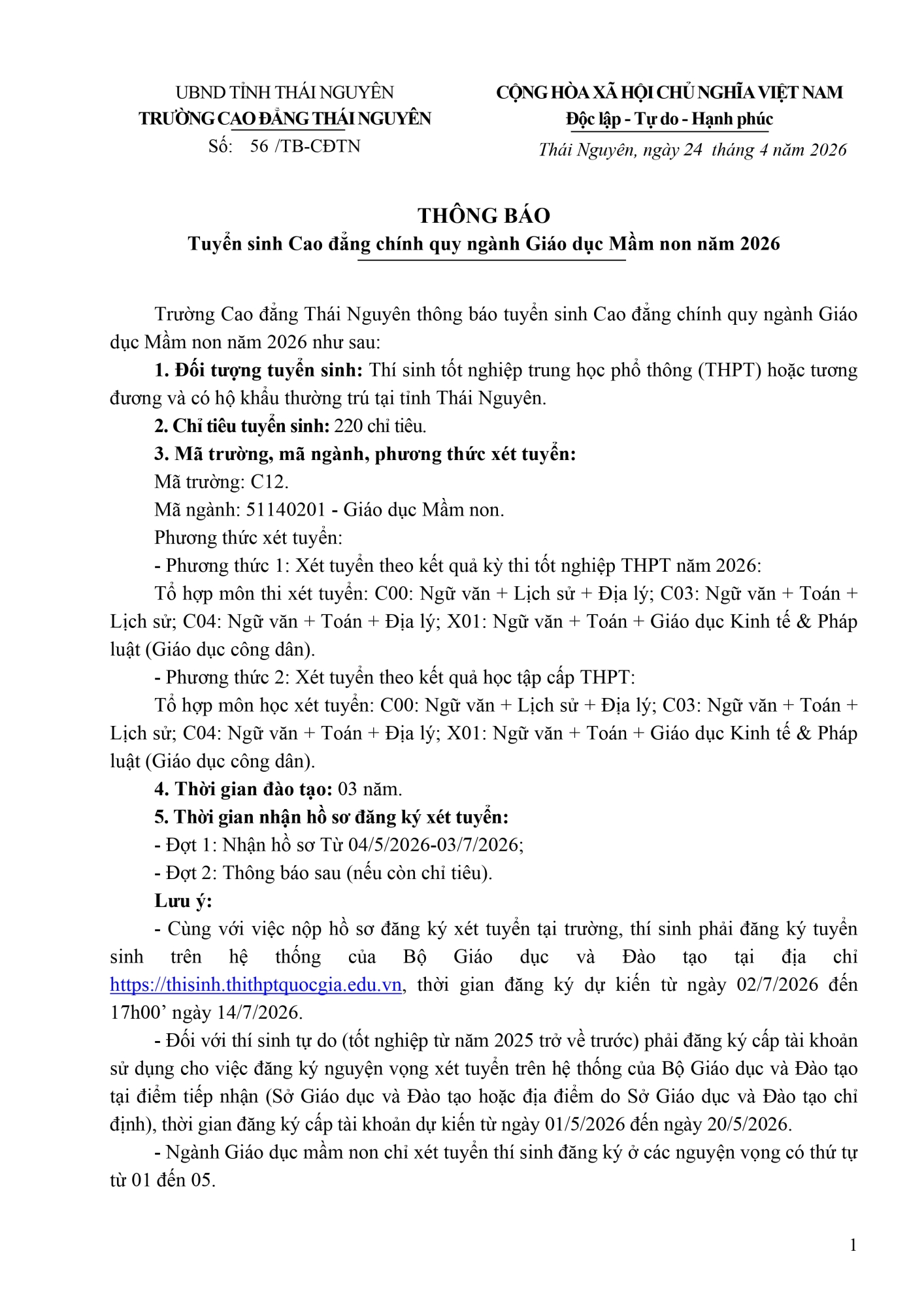 Thông báo tuyển sinh Cao đẳng chính quy ngành Giáo dục Mầm non năm 2026