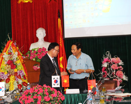 Ảnh : Đồng chí Nguyễn Công Dương tặng quà cho ông Suk-Ho Song và các cộng sự.